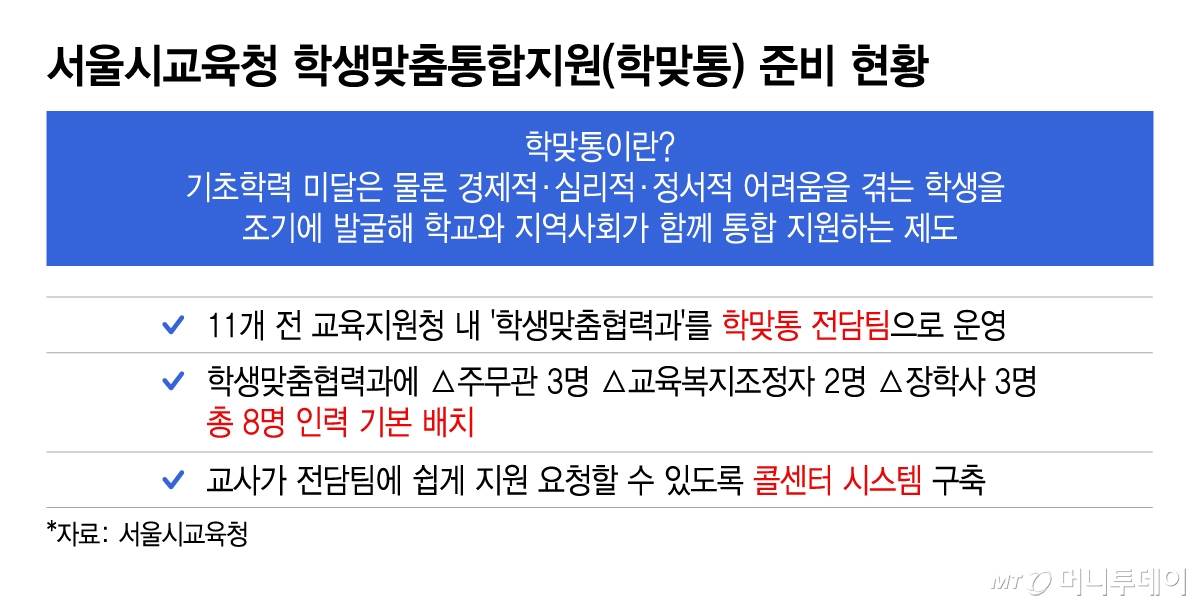 서울시교육청 관계자는 "지원청이 학생을 관리하는 체계는 마련됐지만 학맞통은 기본적으로 학교와 교육청·교육지원청·지역사회가 함께 역할을 분담하는 제도"라며 "학생이 중대한 어려움을 겪거나 학교 차원의 대응이 어려운 경우에 지원청이 나서게 될 것"이라고 설명했다.