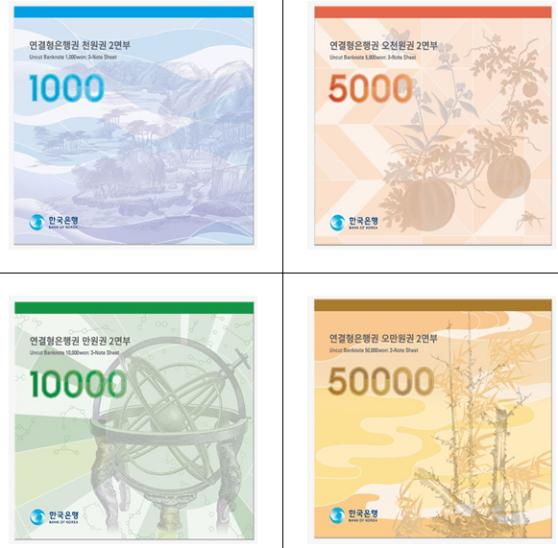 연결형 은행권 1000원권 2면부는 세트당 8100원이며, 5000원권 2면부는 세트당 1만8400원이다. 1만원권 2면부는 세트당 3만100원이고 5만원권 2면부는 세트당 11만6600원에 판매한다. 한국조폐공사 쇼핑몰에서 구매할 수 있으며 입금 완료 후 최대 2주 내 배송될 예정이다.