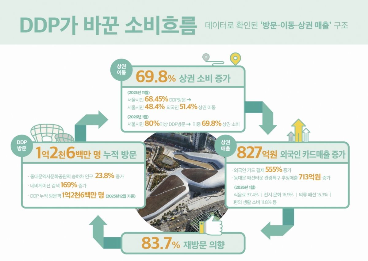설문 조사 응답자의 83.7%(566명)가 '다시 방문하고 싶다' 또는 '기회가 되면 재방문하겠다'고 응답했다. 실제 유동 인구도 지속적으로 느는 추세다. 2024년 동대문역사문화공원역의 승하차 인구는 2572만1503명으로, 2년 전 승하차 인구(2076만 6815명)보다 약 23.8% 증가했다. 같은 기간 DDP 및 연관 지명 관련 내비게이션 검색 건수는 2만1012건에서 5만6417건으로 2.7배 늘었다.