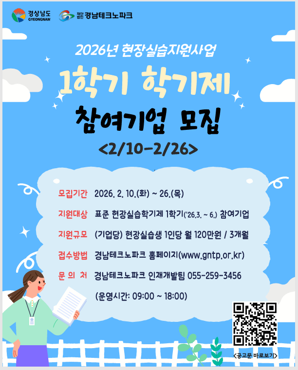 경남도와 경남테크노파크(경남TP)가 산학 연계 취업 지원사업인 '현장실습 지원사업'의 1학기 참여기업을 모집한다고 11일 밝혔다.