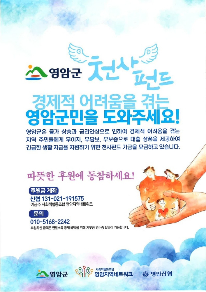 천사펀드는 지역사회의 십시일반을 기금으로 적립해 긴급 지원이 필요한 영암군민에게 생활 안정 자금을 무이자·무보증·무담보로 대출해 주는 영암형 사회적 금융이다.