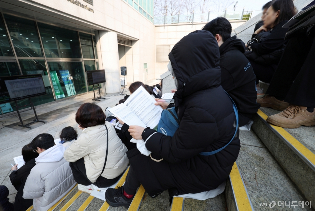 ![[서울=뉴시스] 김진아 기자 = 7일 서울 종로구 성균관대학교 600주년 기념관에서 열린 종로학원 주최 2026 정시 합격 가능선 예측 및 지원전략 설명회에 들어가지 못한 참석자들이 야외 계단에 앉아 설명회를 듣고 있다. 2025.12.07. bluesoda@newsis.com /사진=김진아](https://thumb.mt.co.kr/cdn-cgi/image/f=avif/21/2026/02/2026021316310111996_1.jpg)