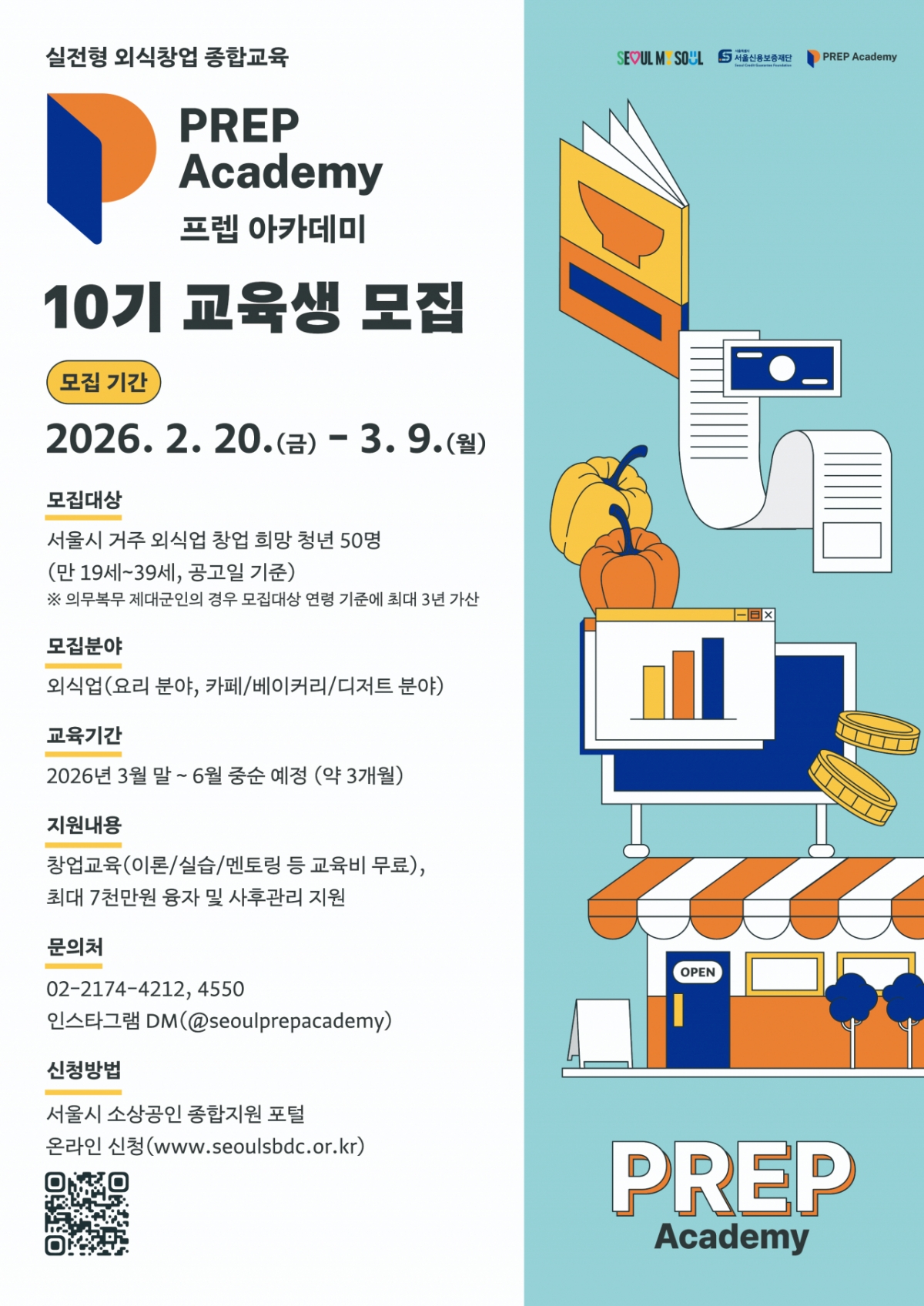 서울시는 외식업·베이커리·식음료 분야 예비 창업 청년 대상 '프렙 아카데미' 정규과정 10기 교육생을 모집한다고 18일 밝혔다. 모집일은 이달 20일부터 3월 9일까지다.