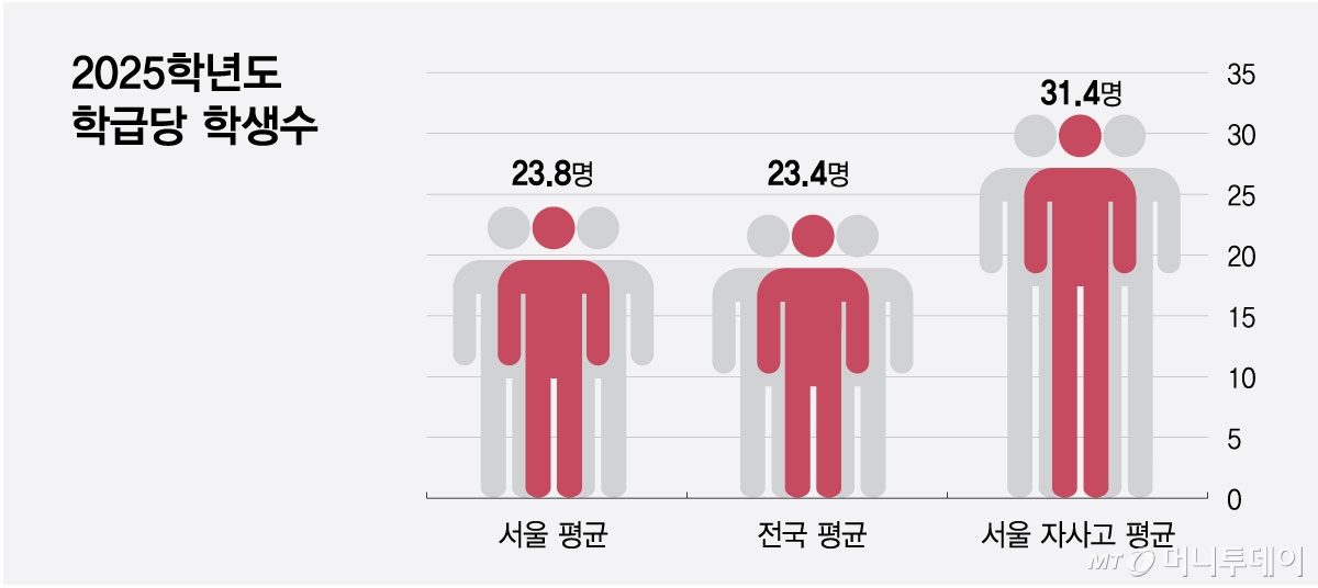 그럼에도 불구하고 자사고 등은 서울시내 일반고보다 평균인원이 많다. 지난해 4월 기준 서울시내 고등학교 학급당 학생 수는 평균 23.8명이다. 반면 자사고 15곳은 평균 31.4명이다. 서울시내 고등학교 학생 수는 20만3087명으로 5년 전인 2020년 22만4316명에서 9.5%가 감소했는데 일부 학교만 대규모를 유지한다면 주변 일반고는 더 빠르게 소형화할 우려가 있다.