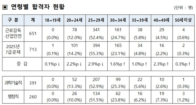성별로는 남성이 452명(69.4%), 여성이 199명(30.6%)이었다. 합격자 평균연령은 29.1세로, 2025년 7급 공채시험 평균연령(28.3세)보다 다소 상승했다. 연령대별로는 20~29세가 419명(64.4%)으로 가장 많았고, 30~39세 199명(30.5%), 40~49세 29명(4.5%), 50세 이상 4명(0.6%) 순이었다.