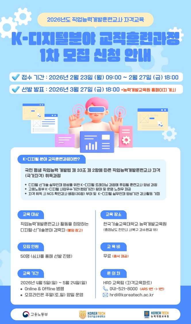 'K-디지털 분야 교직훈련과정'은 AI·SW엔지니어링과 빅데이터, 클라우드 등 디지털·신기술 분야 경력자를 K-디지털 트레이닝 과정에 투입될 수 있는 직업능력개발훈련교사로 양성하는 과정이다. 모집 인원은 50명이며, 교육비는 무료다.
