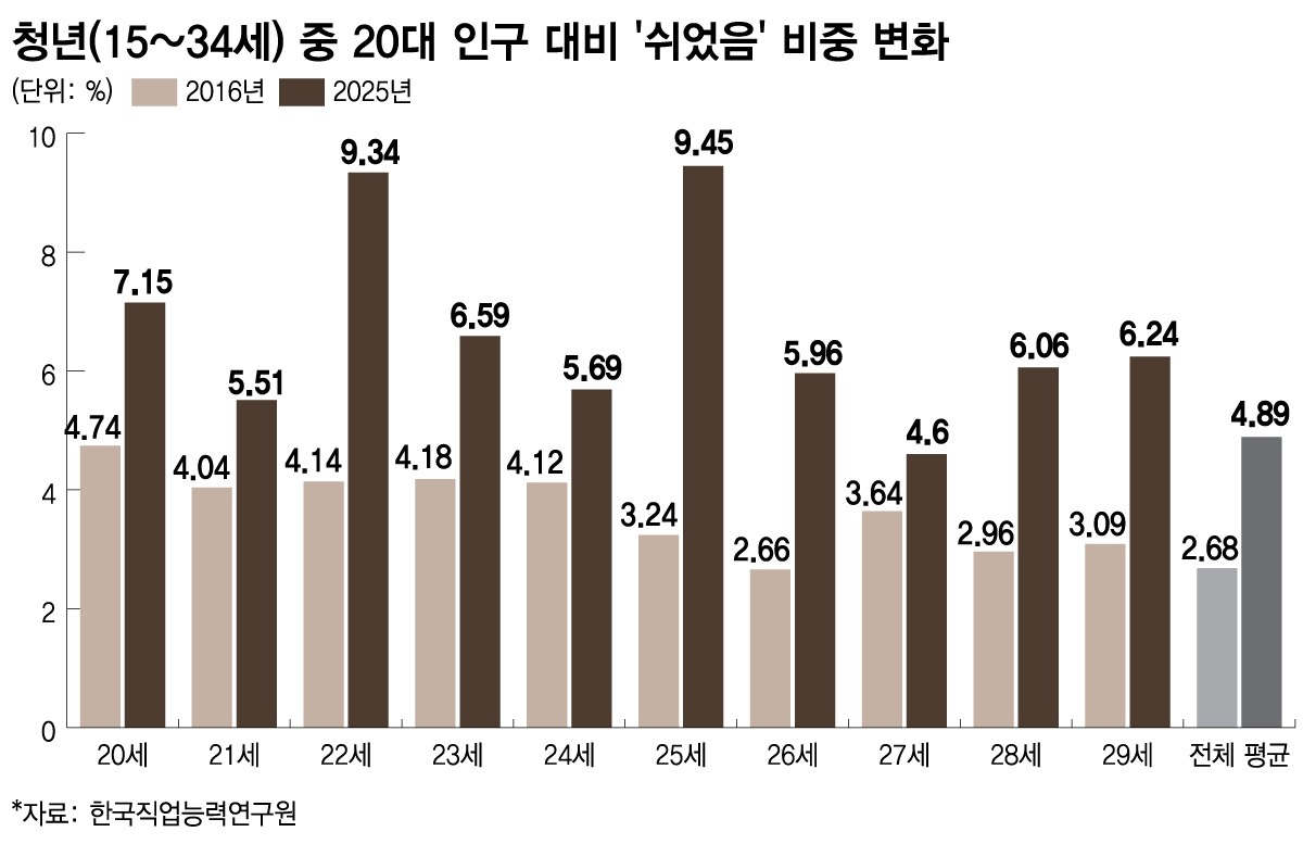 코로나19(COVID-19) 시기에 노동시장에 진입하지 못했던 20대 초반 인구가 20대 후반이 된 지금까지 '고용 사각지대'에 머물러 있는 것으로 나타났다. 20대 중 '쉬었음' 비중이 높아지는 것은 개인이 아니라 사회적 문제라는 지적이 나온다.