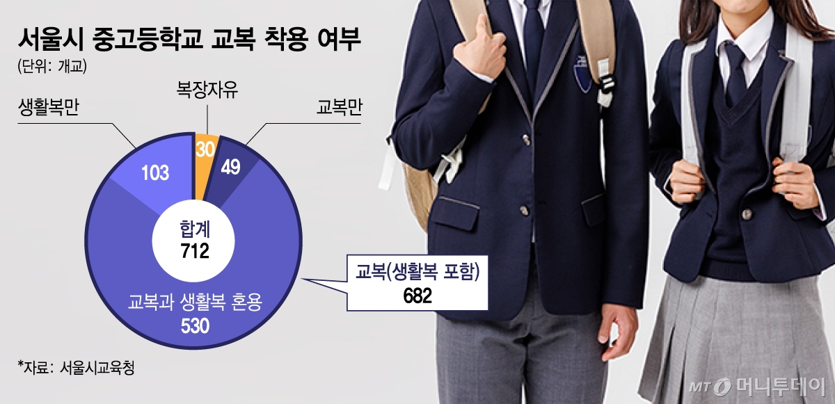 22일 서울시교육청이 지난해 8월 실시한 조사에 따르면, 시내 712개 중·고등학교 가운데 530개교(74.4%)가 정장형 교복과 생활복을 병행하고 있다. 생활복만 착용하는 학교는 103개교, 정장형 교복만 유지하는 학교는 49개교였다.