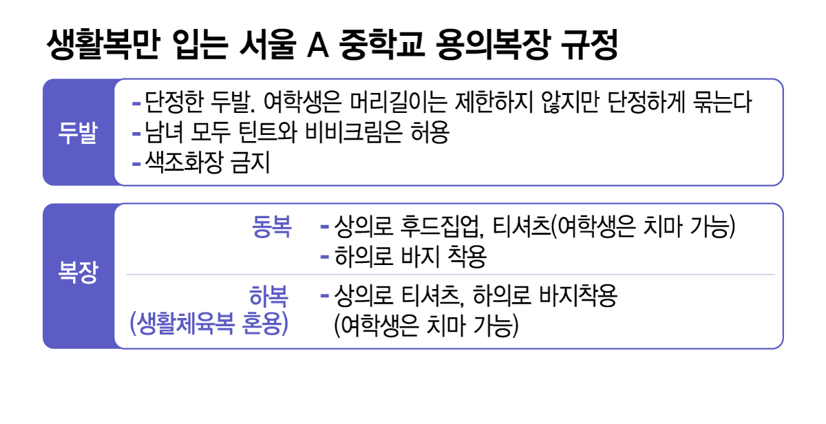 송 교사는 "학교에 따라 생활복도 색상과 모양이 비슷하면 지정 구매처가 아니라도 허용하는 곳이 있다"며 "교복이든, 생활복이든 학교 구성원들이 토론과 합의를 통해 규칙을 정하고 이를 지키려는 노력이 필요하다"고 설명했다.