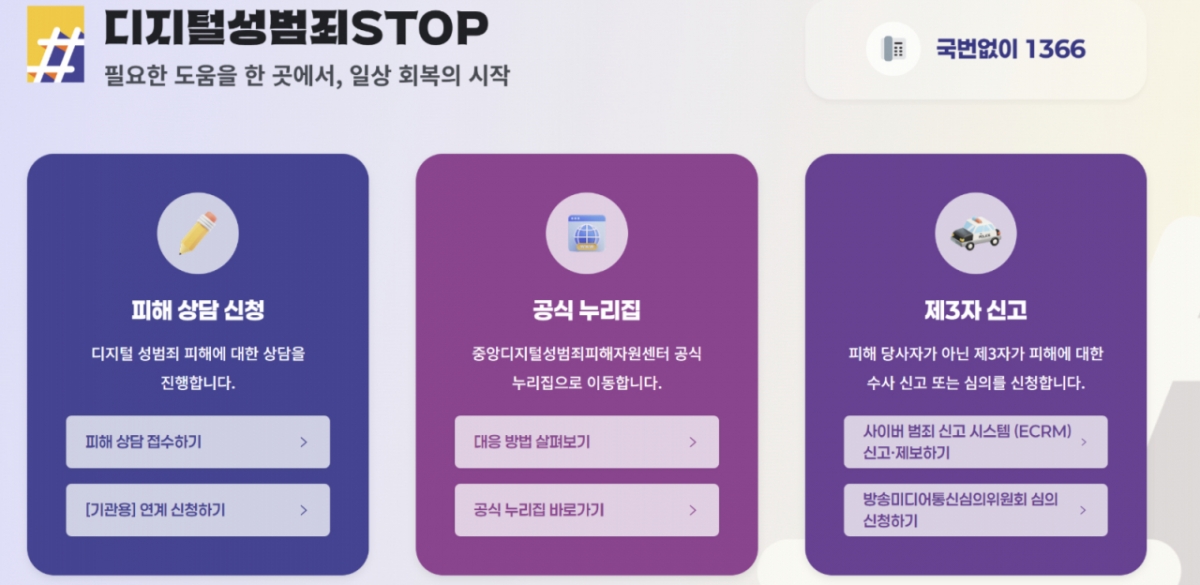특히 중앙 디성센터, 경찰청, 방송미디어통신심의위원회 등에 분산돼 있던 신고 창구를 하나로 통합해 피해자뿐 아니라 제3자도 불법촬영물 등을 한 곳에서 신고할 수 있도록 했다.
