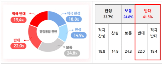 지난 12일 국회 행정안전위원회 의결에 따라 오는 7월1일 목표로 추진되는 행정통합에 대해서는 반대가 찬성보다 많았다. '반대'는 41.5%, '찬성'은 33.7%로 나타났다.