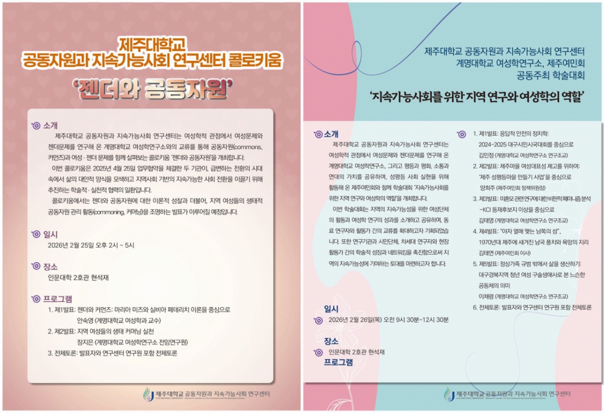 계명대학교 여성학연구소가 오는 25~26일 제주대학교 인문대학 현석재에서 제주 지역 연구기관 및 여성단체와 함께 '젠더와 공동자원'(Commons)을 주제로 콜로키움과 학술교류 행사를 연다고 24일 밝혔다.