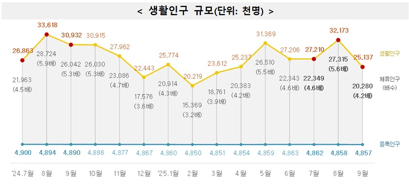 월별로 보면 지난해 7월 생활인구는 약 2721만명, 8월은 약 3217만명, 9월은 약 2514만명이었다. 7·8월은 전년 동월과 비슷한 수준이었으나, 9월은 추석 연휴 영향 등으로 크게 감소해 3분기 전체로는 전 분기 및 전년 동분기 대비 소폭 줄었다. 정부는 지난해 9월 추석 연휴에 따른 기저효과와 올해 10월 긴 연휴(개천절~추석~한글날)로 이동이 분산된 점이 감소 요인으로 작용한 것으로 분석했다.