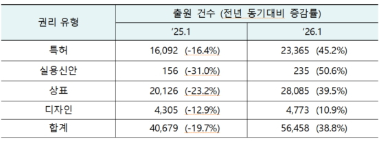 지식재산처는 지난 1월 국내 지식재산권 출원 건수가 전년 1월(4만679건) 대비 약 39% 증가한 5만6458건을 기록했다고 24일 밝혔다.