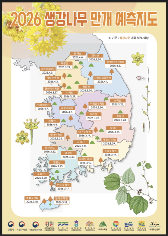산림청은 봄철 생강나무, 진달래, 벚나무류의 개화 시기를 담은 '2026년 봄철 꽃나무 개화 예측지도'를 24일 발표했다.