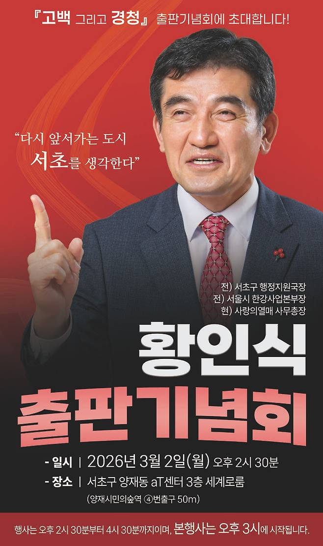 24일 출판업계 등에 따르면 이번 출판기념회는 다음달 2일 오후 서초구 양재동 소재 aT센터 3층 세계로룸에서 개최된다. 이번 행사에서 황 사무총장이 '다시 앞서가는 서초를 생각한다'를 주제로 그동안 공직 생활과 사회복지 분야에서 쌓아온 경험을 나누고, 지역 사회에 대한 깊은 고민과 비전을 진솔하게 풀어낼 예정이다.