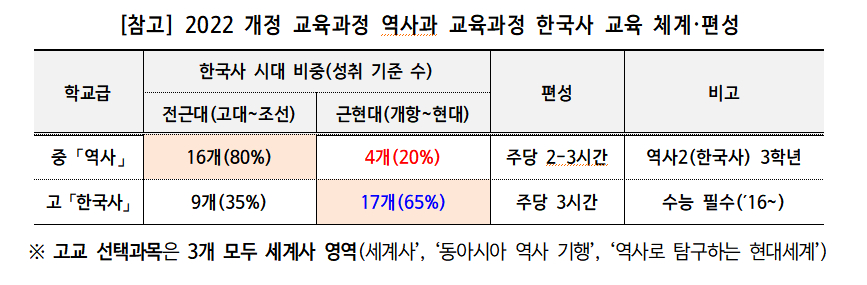 현행 중학교 '역사'는 전근대 80%, 근현대 20%로 근현대사 비중이 적다. 근현대사를 배우는 중학교 3학년 2학기에는 고입 준비 등으로 집중이 어려운 시기기도 하다. 교육부는 상반기 중 근현대사 시수 비중을 결정해 확대를 요청할 예정이다. 고등학교 교육과정에서는 학생이 접하는 역사 콘텐츠의 내용·근거 등을 탐구 과정을 통해 분석·비평하며 주체적 미디어 수용 태도를 함양할 수 있는 선택과목 신설을 요청한다.