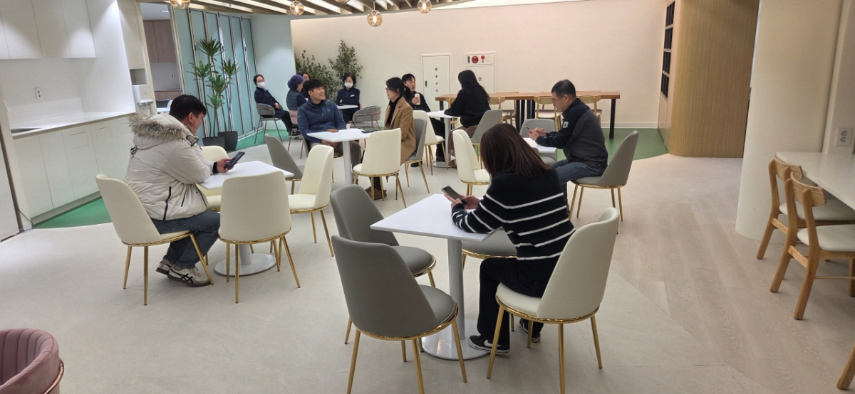 행복쉼터에는 계단형 휴게공간, 포켓형 공간, 창가 테이블 등을 조성하고, 공간 특성에 맞는 테이블과 의자를 배치했다. 개인 방문객은 물론 가족 단위 이용객도 편리하게 이용할 수 있도록 동선을 정리했으며, 소형 싱크대도 설치했다. 직원과 미화원을 위한 별도 휴게공간도 함께 마련했다.
