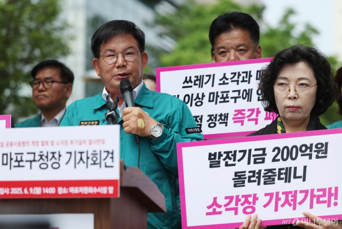 ![[서울=뉴시스] 김진아 기자 = 박강수 마포구청장이 9일 서울 마포구 마포자원회수시설 앞에서 마포자원회수시설 공동이용협약 개정 철회 및 소각장 추가설치 반대 기자회견을 하고 있다. 2025.06.09. bluesoda@newsis.com /사진=김진아](https://thumb.mt.co.kr/cdn-cgi/image/f=avif/21/2026/03/2026030314460336436_1.jpg)