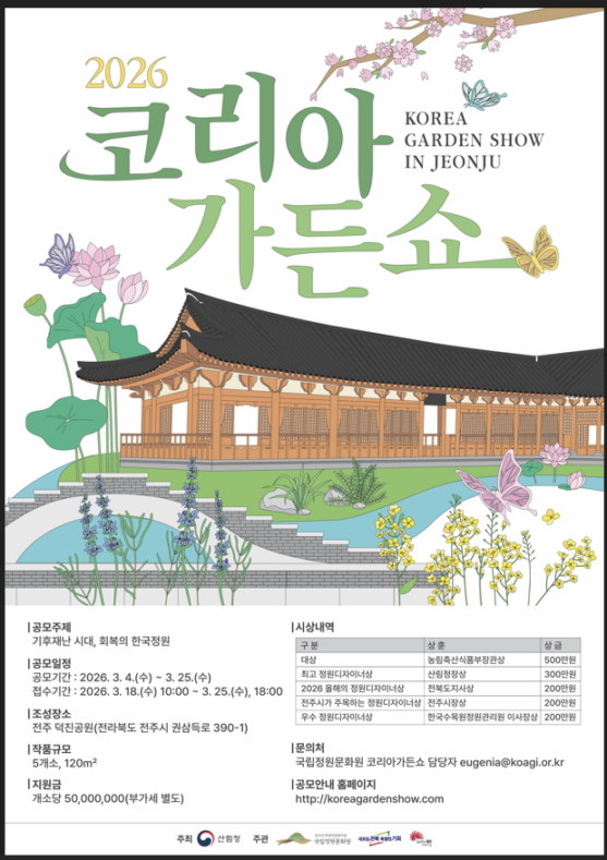 산림청 산하 한국수목원정원관리원은 산림청이 주최하고 국립정원문화원, 전라북도·전주시가 공동주관하는 '2026 코리아가든쇼(전주)'에서 전시할 정원작품을 오는 25일까지 모집한다고 4일 밝혔다.