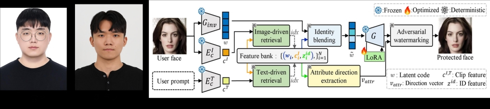 추가적으로 '속성 왜곡'(attribute distortion) 기법을 적용해 사용자가 눈, 코, 입 등 특정 얼굴 부위를 텍스트 프롬프트로 지정하면, 해당 부위와 관련된 정체성 방향을 인공지능 내부 표현 공간에서 찾아낸 뒤, 그 방향으로 미세한 워터마크 신호를 삽입함으로써 원본 이미지는 자연스럽게 유지하면서도, 딥페이크 생성 과정에서는 해당 부위가 어색하게 표현되도록 최적화했다.
