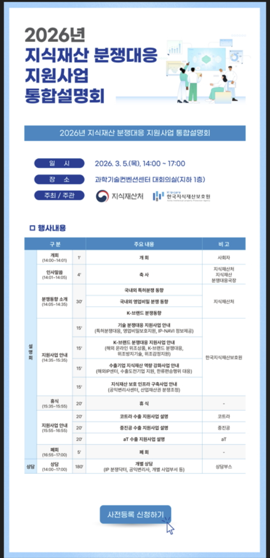 한편, 지식재산처는 이날 과학기술컨벤션센터(서울 강남구)에서 '2026년 지식재산 분쟁대응 지원사업 통합설명회'를 개최하고 현장상담도 진행했다.