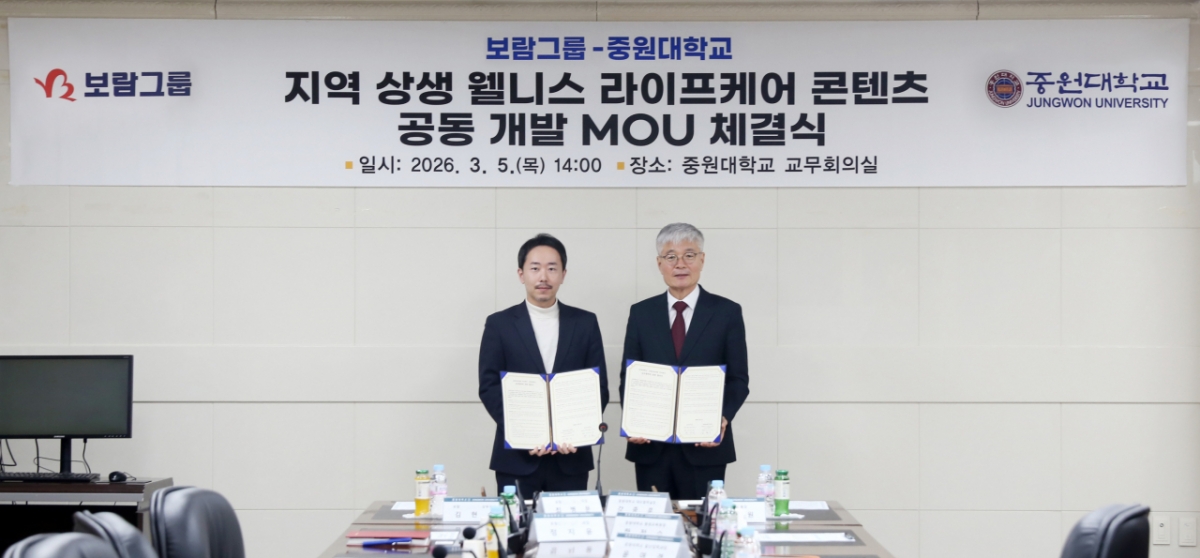 중원대학교가 지난 5일 보람그룹과 지역 상생 웰니스 라이프케어 콘텐츠 개발을 위한 업무협약(MOU)을 체결했다고 9일 밝혔다.