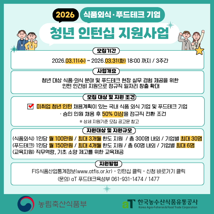 한국농수산식품유통공사(이하'aT')가 '식품외식·푸드테크기업 청년 인턴십 지원사업'에 참여할 업체를 오는 31일까지 모집한다고 11일 밝혔다.