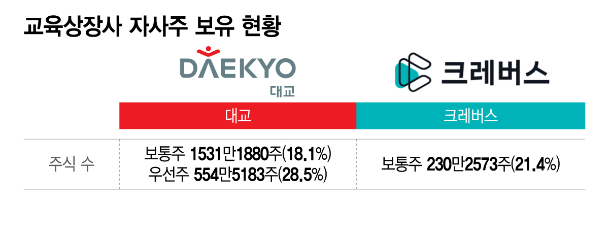 대교는 지난해 말부터 개정상법에 대응하기 위해 EB(교환사채) 발행, 주식교환 등에 나섰다. 지난해 10월에는 사모펀드를 대상으로 자사주 196만주를 교환 대상으로 하는 50억원 규모의 EB를 발행했다. 같은 해 11월에는 오로라월드에 자사주 225만주를 주고 대신 오로라월드 자사주 20만주를 받는 자사주 주식교환이 있었다. 대교 관계자는 "자사주를 일률적으로 축소하기보다는 주주 효익과 기업가치를 제고할 수 있도록 단계적으로 활용해 나가겠다"고 말했다.