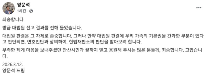 판결 직후 양 전 의원은 SNS를 통해 "대법원 판결은 존중한다"면서도 "가족의 기본권이 간과된 부분이 있다면 변호인단과 상의해 헌재의 판단을 받아보겠다"며 헌법소원 심판 청구 가능성을 열어뒀다.