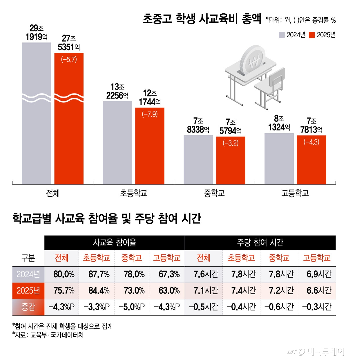 12일 교육부와 국가데이터처가 발표한 2025년 초·중·고 사교육비 조사 결과에 따르면, 사교육비 총액은 27조5351억원으로 전년 대비 5.7% 감소했다. 사교육비 총액이 줄어든 건 2012년, 2020년에 이어 이번이 세번째다. 2012년에는 EBS 교재와 수능을 연계하는 정책이, 2020년에는 코로나19(COVID-19)가 영향을 미쳤다.