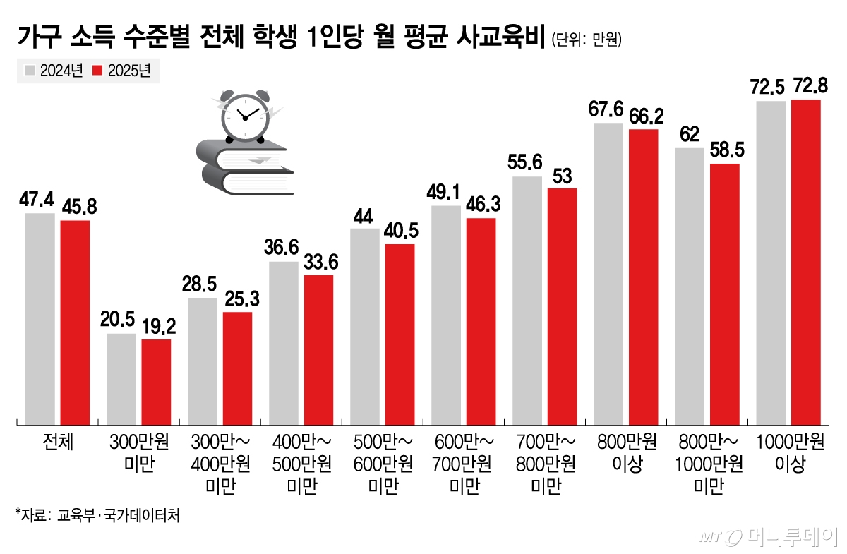 12일 교육부와 국가데이터처가 전국 3000여 학급을 대상으로 한 '2025년 초·중·고 사교육비 조사 결과'에 따르면 가구의 소득별 사교육비 지출 차이가 전년 대비 커졌다.