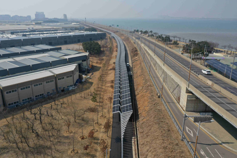 '경기 햇빛 자전거길'은 자전거도로 상부에 디자인 특화 태양광 설비를 설치하는 재생에너지 사업이다. 이용자에게는 안전하고 쾌적한 그늘을 제공하고, 동시에 친환경 전력을 생산하는 일석이조의 효과를 노렸다.