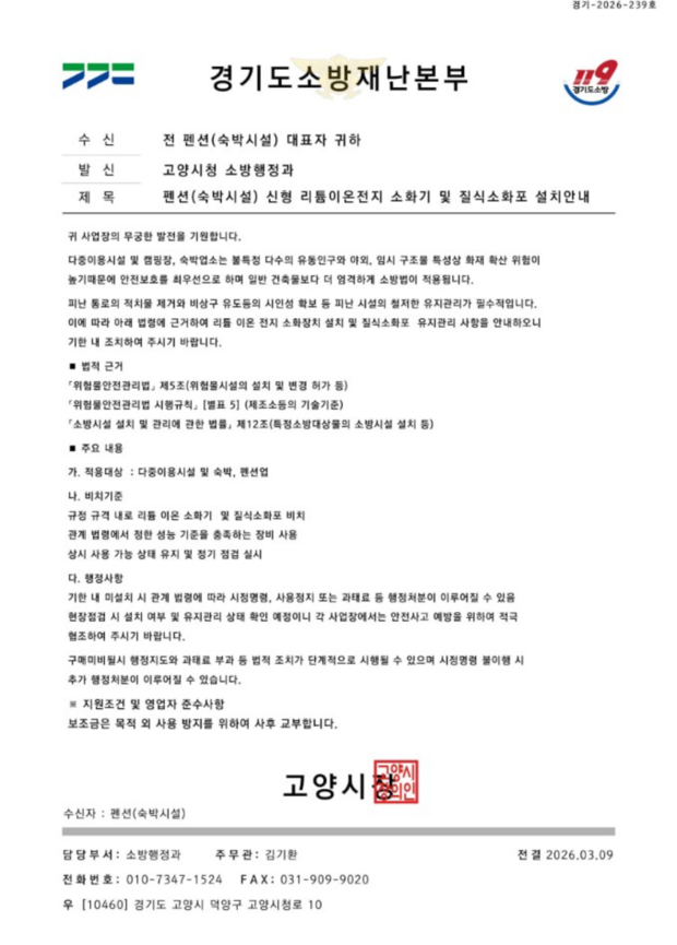 #고양시에서는 최근 대형 공연 개최를 앞두고 숙박업소를 대상으로 시청을 사칭한 물품 판매 시도가 발생했다. '소방시설 설치 및 관리에 관한 법률'을 근거로 리튬이온 전지 소화장치 설치와 질식소화포 유지 관리 의무가 있다며 시 공문서를 제시하고 특정 제품 구매와 설치를 유도했다.