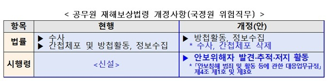 이번 개정안은 '국가정보원법' 개정·시행(2024년 1월 1일)과 지난달 개정된 '공무원 재해보상법'의 후속 조치로, 오는 5월 28일부터 시행될 예정이다.
