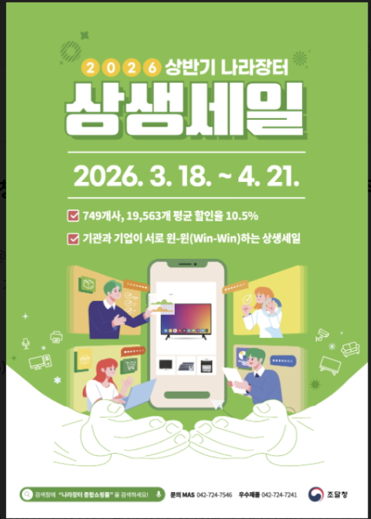 조달청은 오는 18일부터 다음 달 21일까지 5주간 '2026년 상반기 나라장터 상생세일'을 개최한다고 17일 밝혔다.