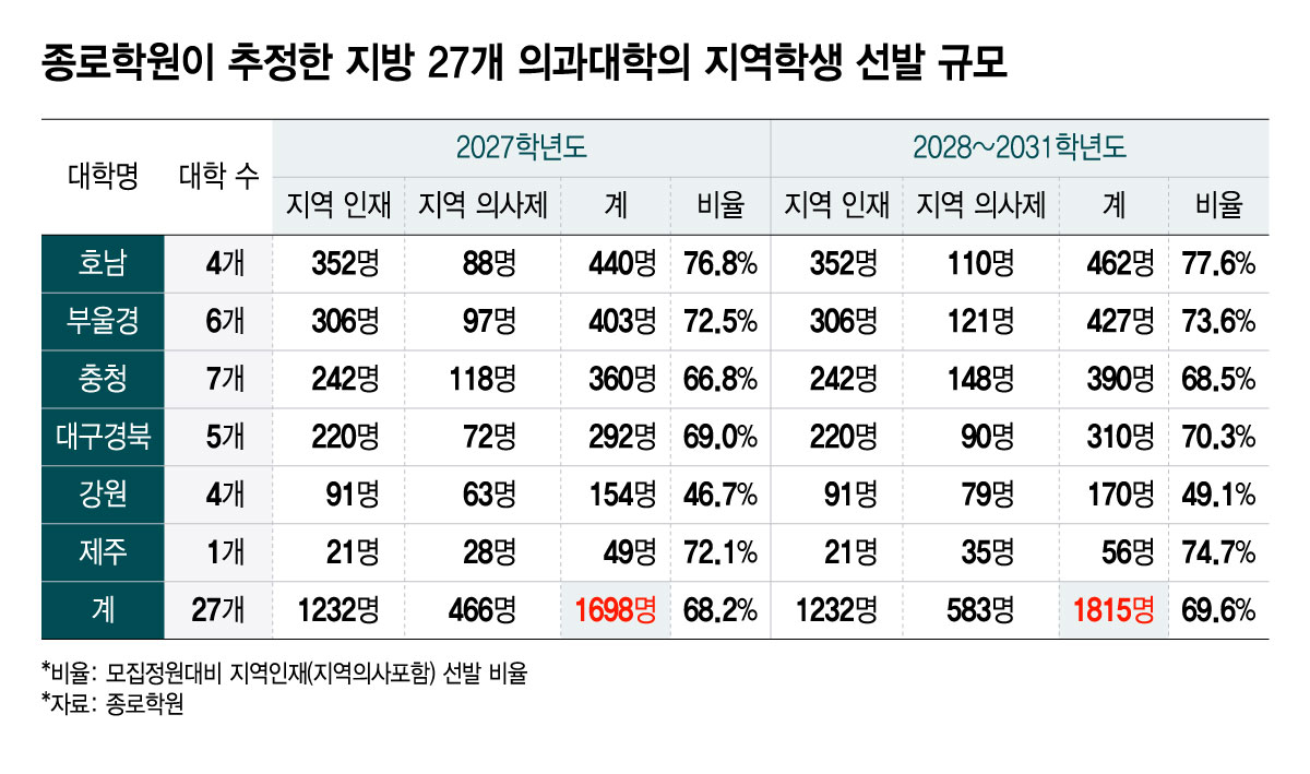 2027학년도 입시에서 지방 의과대학이 10명 중 7명을 해당 지역학생으로 채우게 될 것이라는 분석이 나왔다.