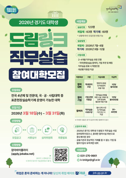 경기도와 경기도일자리재단이 오는 31일까지 '대학생 드림링크 직무실습' 사업에 참여할 협력대학 15곳을 모집한다고 18일 밝혔다.
