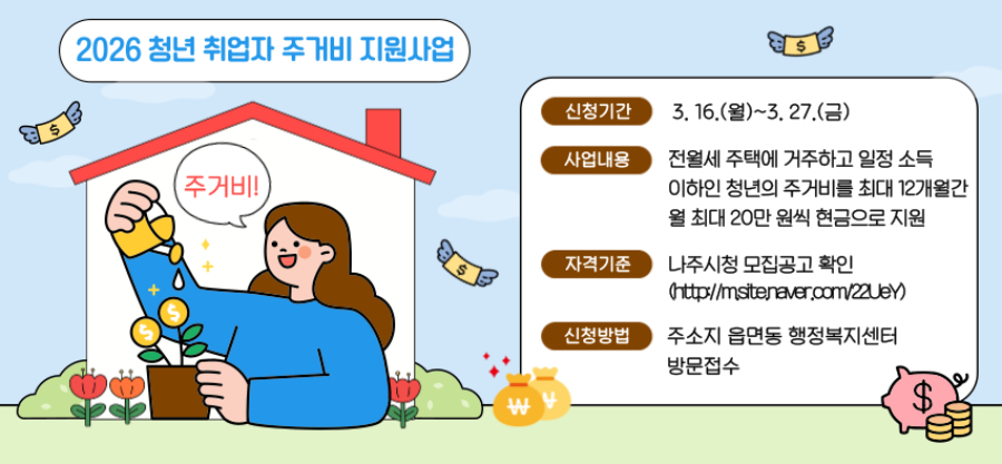나주시는 선정된 청년에게 생애 1회에 한해 최대 12개월 동안 월 20만원(최대 240만원)의 주거비를 지원한다.