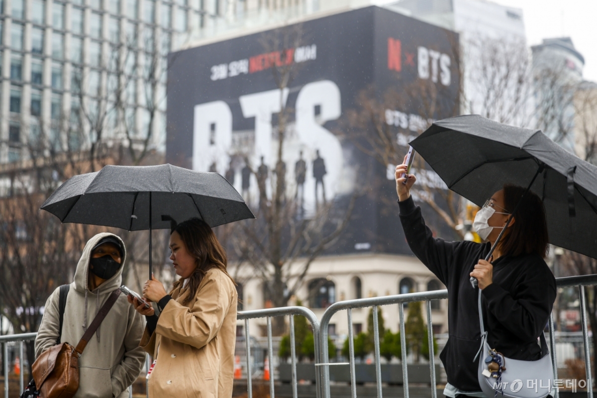 ![[서울=뉴시스] 정병혁 기자 = 방탄소년단(BTS)의 서울 광화문광장 컴백 공연을 앞둔 18일 서울 종로구 광화문광장을 찾은 외국인 팬들이 BTS 랩핑 앞에서 사진을 찍고 있다. 2026.03.18. jhope@newsis.com /사진=정병혁](https://thumb.mt.co.kr/cdn-cgi/image/f=avif/21/2026/03/2026031818011422256_1.jpg)