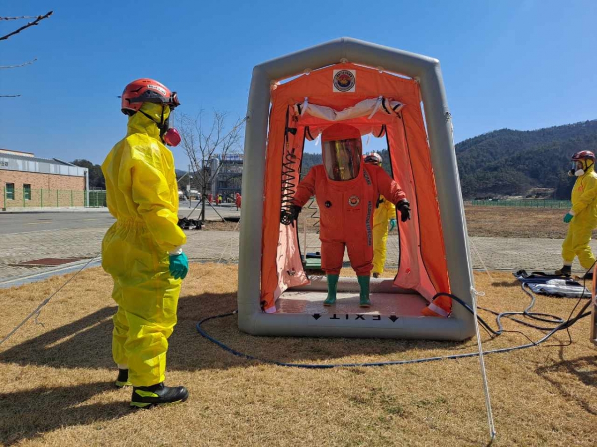 특히 이번 훈련에서는 자력 대피가 어려운 구조대상자에 대한 '정밀 인체 제독' 절차에 중점을 뒀다. 구조대원들은 의복 제거와 세척, 오염수 관리 등 전 과정을 실제 상황과 동일하게 수행하며 2차 오염 방지와 생존율 향상에 초점을 맞췄다.