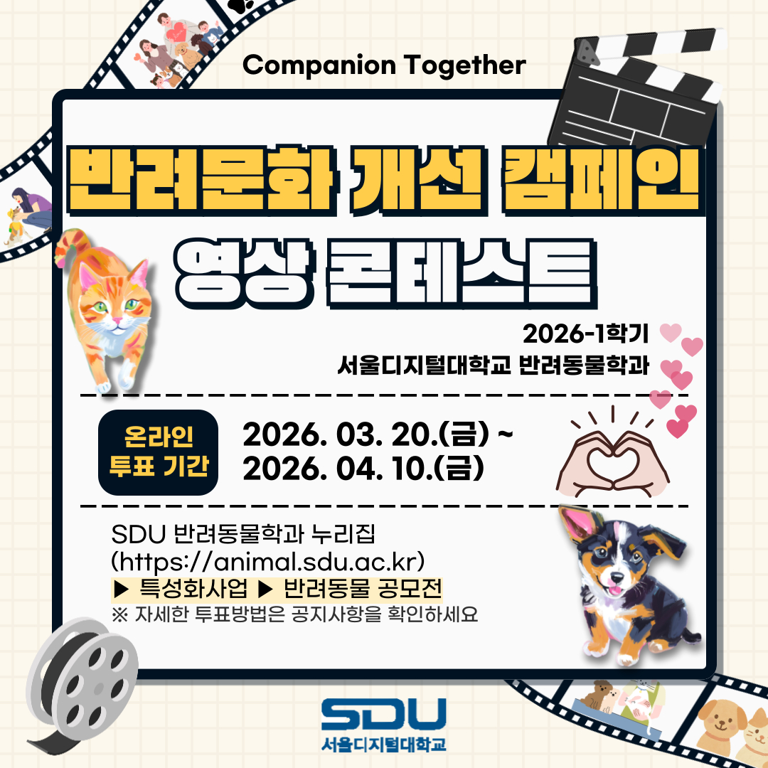 서울디지털대학교 반려동물학과가 다음달 10일까지 '제2회 컴패니언 투게더: 반려문화 개선 캠페인' 숏폼 우수작을 선정하는 온라인 시민투표를 진행한다고 20일 밝혔다.