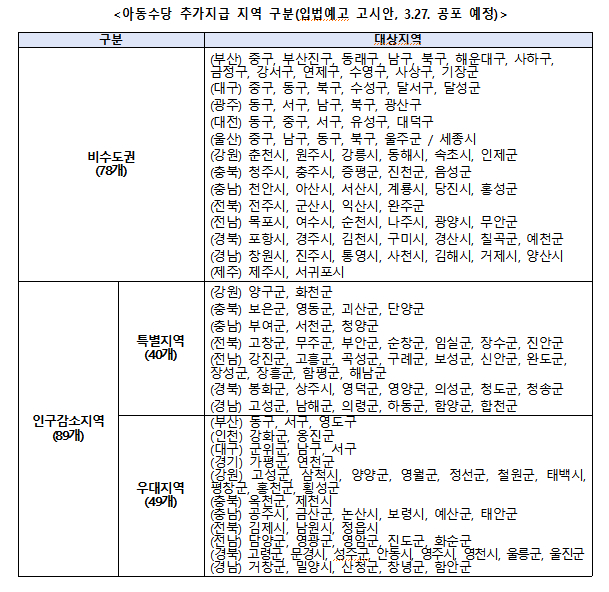시행령에서는 '아동수당법'이 위임하고 있는 아동수당 추가지급 지역과 금액을 구체화했다. 비수도권에 거주하는 아동은 월 5000원, 인구감소지역 중 우대지역에 거주하는 아동에게는 월 1만원, 특별지역에 거주하는 아동에게는 월 2만원을 추가 지급하도록 했다.