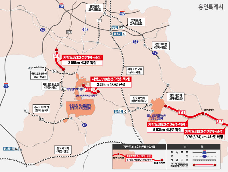 도심 상습 정체 해소를 위한 '지방도 321호선 역북~서리 구간' 확장도 추진된다. 학고개터널부터 사기막골삼거리까지 3.06㎞를 기존 2차로에서 4차로로 넓히는 공사로, 약 534억원이 투입된다. 용인대 일대의 교통 체증을 덜고 국도 45호선의 교통량을 분산시키는 역할을 톡톡히 할 것으로 기대된다.