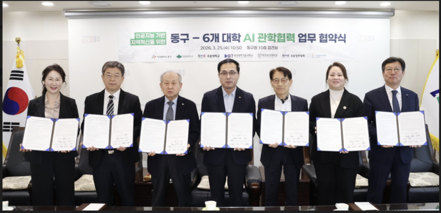 대전 동구가 25일 대전대학교, 우송대학교, 대전과학기술대학교, 대전보건대학교, 우송정보대학, 한국폴리텍Ⅳ대학 대전캠퍼스와 '인공지능(AI) 기반 지역혁신을 위한 관학협력 업무협약'을 했다.