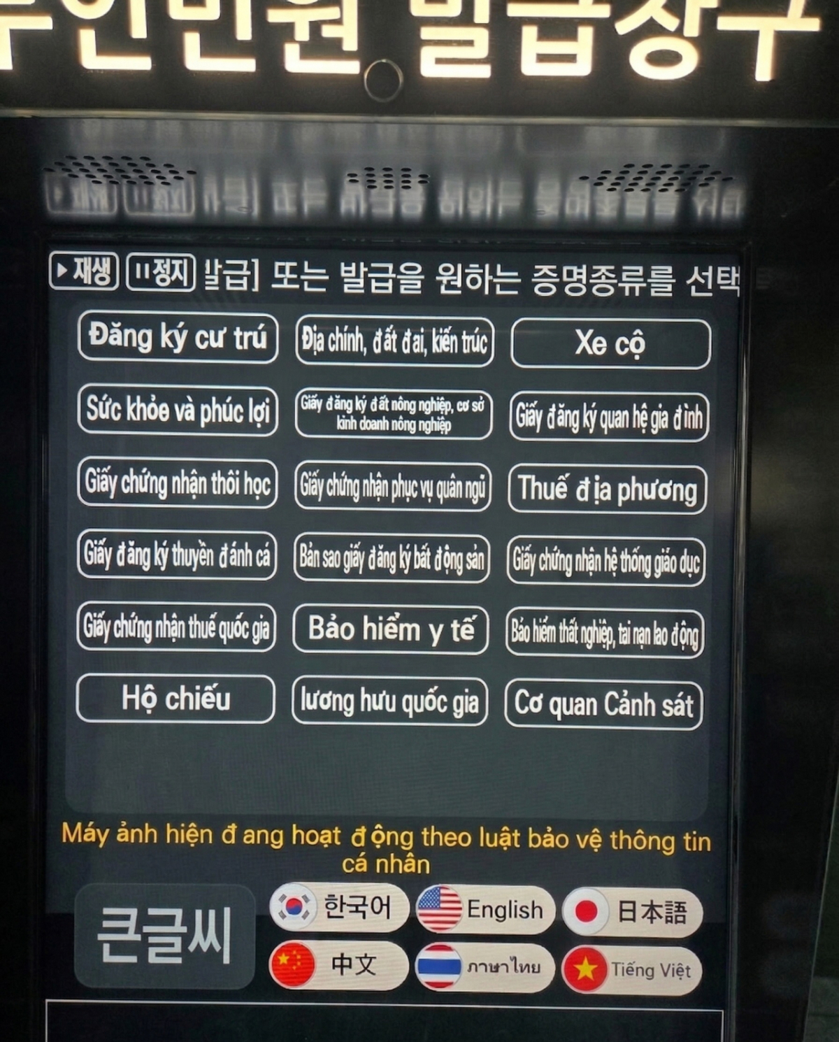 시범 운영 장소는 외국인 방문이 잦은 중구청사와 다문화 거주 비율이 높은 광희동 주민센터 2곳이다. 지원 언어는 영어, 중국어, 베트남어, 일본어, 태국어 등 5개 국어다. 초기 화면에서 원하는 언어를 선택하면 안내부터 발급까지 전 과정이 해당 국어로 전환돼, 타인의 도움 없이 43종의 서류를 손쉽게 발급받을 수 있다. 시범 기기 2대는 24시간 운영되어 야간과 주말에도 이용이 편리하다.