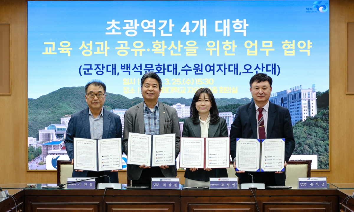 백석문화대학교가 지난 25일 교내 자유관에서 군장대학교, 수원여자대학교, 오산대학교와 교육혁신 성과 공유 및 확산을 위한 초광역 협력 업무협약을 체결했다고 26일 밝혔다.