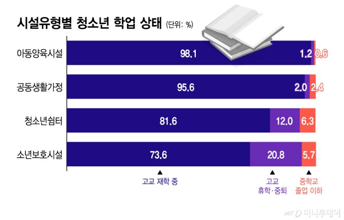 촉법소년(형사미성년자·10~13세) 연령하향이 사회적 논제가 된 가운데 소년보호시설 청소년(15~18세) 4명 중 1명은 고등학교를 안 다니거나 쉬고 있는 것으로 나타났다. 소년보호시설은 대부분 소년법을 적용받아 보호위탁되거나 소년원 출원 후 원가정에서 생활이 어려워 시설에서 지내며 독립을 준비하는 곳이다.