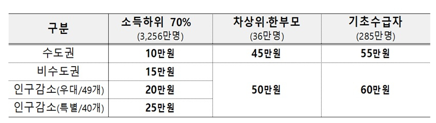 추경안의 핵심은 고유가 피해 지원이다. 정부는 총 4조8252억원을 투입해 소득 하위 70% 국민을 대상으로 1인당 10만~60만원을 차등 지급할 계획이다. 지원금은 지역과 소득 수준에 따라 달라지며, 수도권은 10만원, 비수도권은 15만원, 인구감소 우대지역은 20만원, 인구감소 특별지역은 25만원이 지급된다.