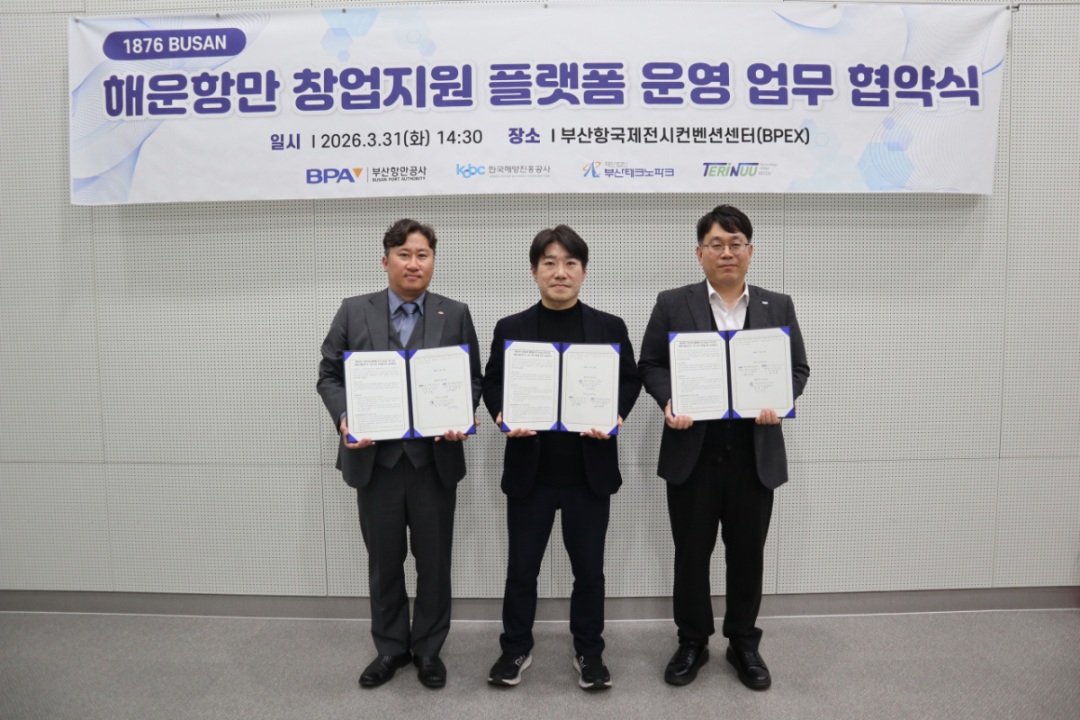 부산항만공사(BPA)와 한국해양진흥공사가 31일 부산테크노파크(부산TP)와 해운항만 기술창업 지원 플랫폼 '1876 BUSAN'의 위탁협약을 체결하고 사업설명회를 열었다.